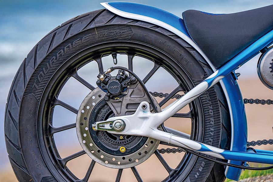 スイングアームがフレームと一体となり、純正リヤホイールは上下に動かない。ブレーキはこのリヤのみが作動する。変わりようをカスタムのポイントだとするなら確かにそうかと思える1台となっている。