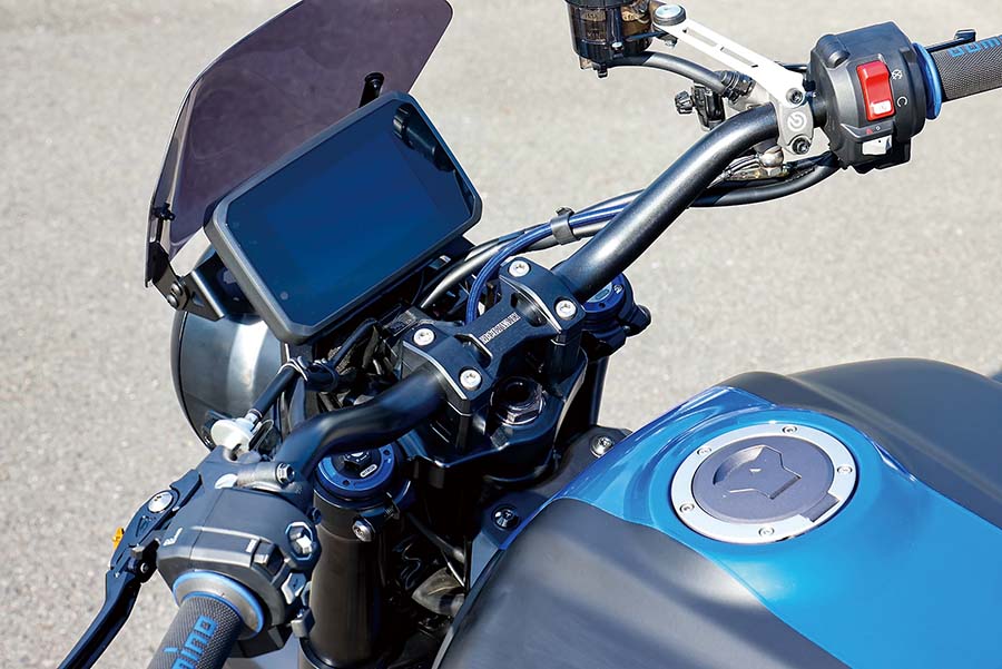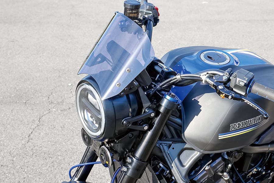 全体のフォルムを引き締めながら防風効果を得るメーターバイザーキットは開発中の製品。アルミ3D切削でステー上側にモリワキのカタカナロゴも入るヘッドライトステーはブラック、シルバー、チタンゴールドの各カラーを用意する。価格は1万4300円。ほかにステムキットも開発中だ。なおクラッチレバーにはZETAパイロットレバーが装着される。