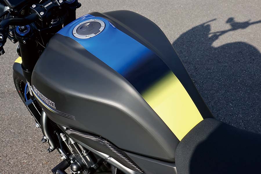 マットブラックで仕立てられた外装。燃料タンク上には青×黄のモリワキラインが入る。