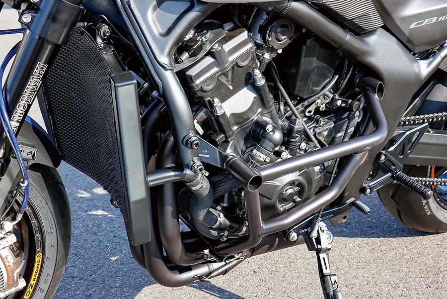 転倒時にエンジン周辺へのダメージを最小限に抑えるアイテムでありながらエンジンマウント部2か所と左右の連結バーの3か所締結構造を採り、エンジンサイドを抱きかかえるようにパイプをレイアウトして保護機能とデザイン性を高次元で両立させるエンジンガードキットは開発中。前側取り付け部奥に見えるアルミ3D切削により強度を高めたエンジンハンガープレートは4万6200円。