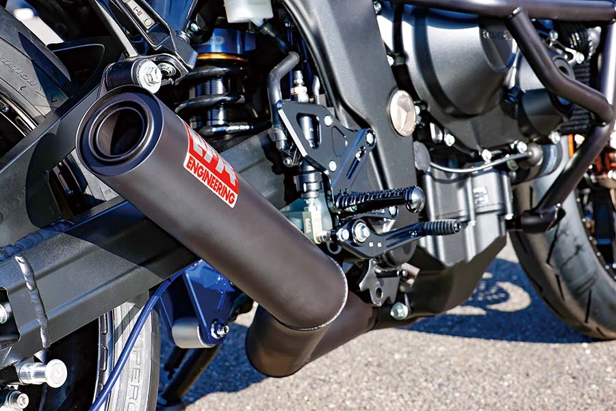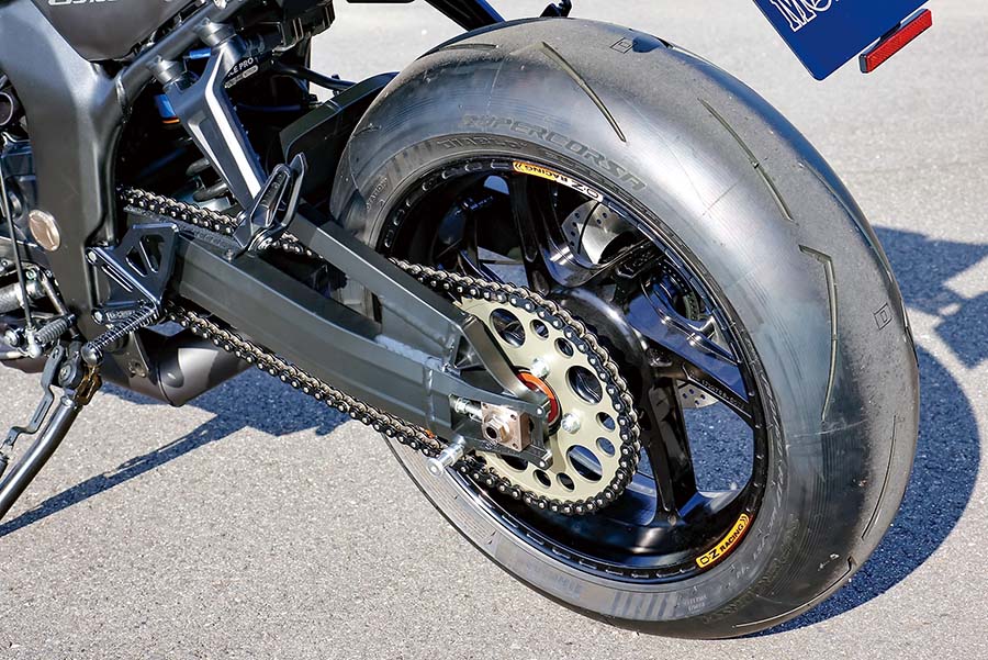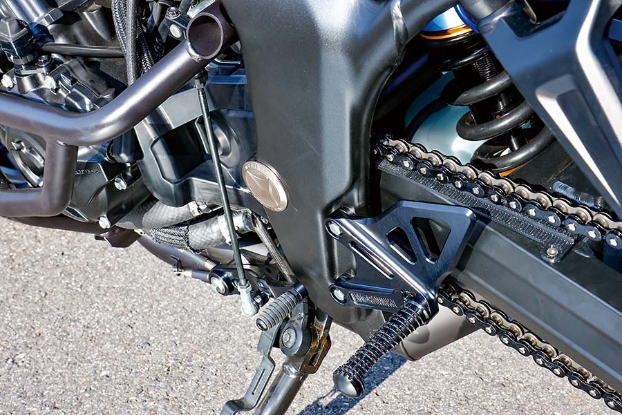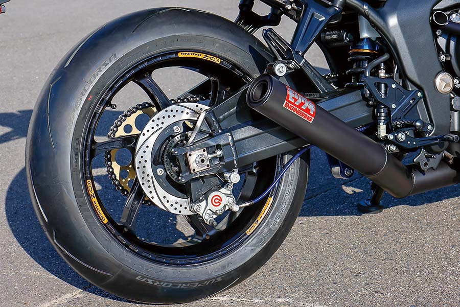 純正のへの字/変則テーパー形状アームに対してストレートデザインとしエンド部を削り出し、上側スタビライザーを加えたスイングアームは開発中でこれに付くスタンドフックやリンクプレートも同様に開発が進んでいる。なおこの車両ではO・Zレーシングのアルミ鍛造、GASS RS-Aホイールも装着している。