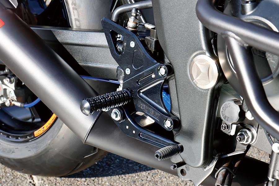 バックステップキットは3D切削によってホルダーとプレート、ヒールガードの3部品一体構造デザインを具体化し、軽量高剛性、そしてモリワキが導き出したCB1000F向きの4ポジションで仕上げる。