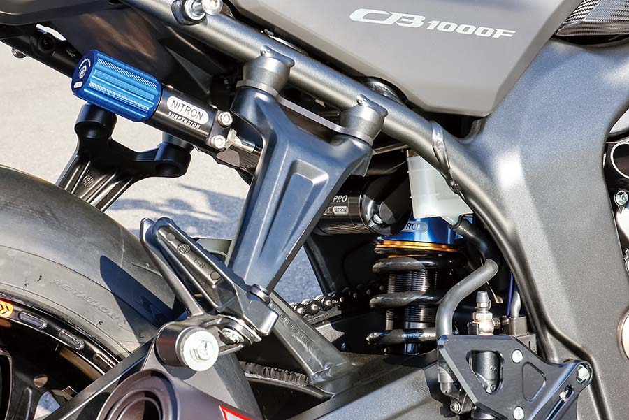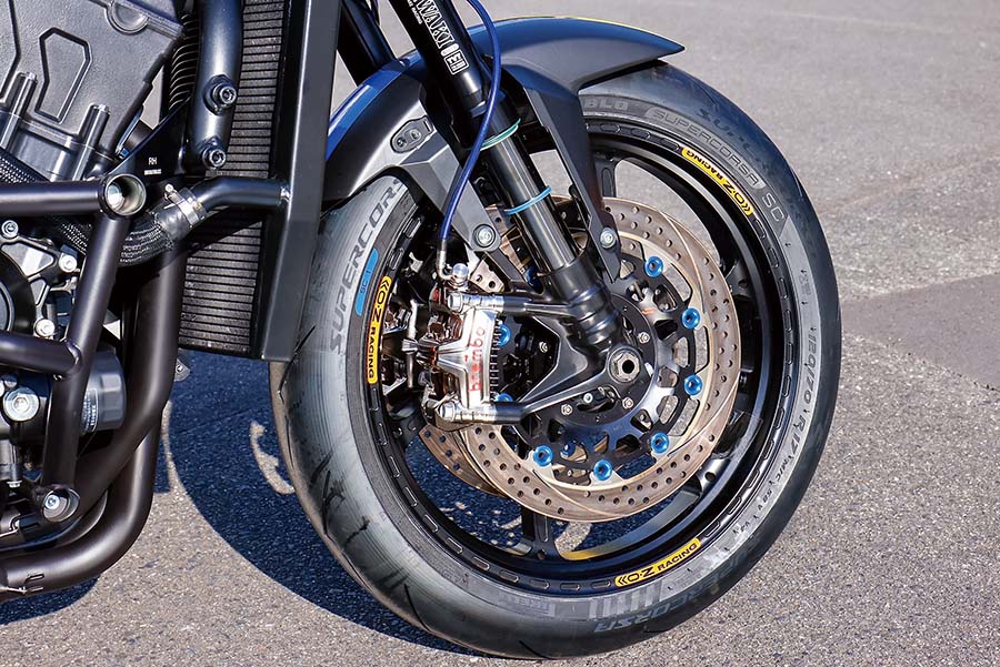 細かいセッティングに対応し、CB1000Fの能力を引き出すサスペンションもナイトロンと開発中。フロントはφ41mm倒立フォークの内部カートリッジを入れ替えて使うモリワキ×ナイトロン・フォークカートリッジNTR TVT PROを展開予定だ。フロントブレーキまわりはブレンボGP4-MSキャリパー+サンスター・ワークスエキスパンドディスクの構成だ
