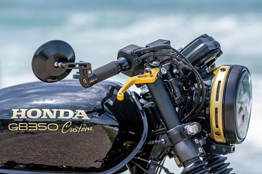 シンプルなGBだからこそ狙える、かつ違和感がないカフェレーサースタイル。ブラックに染め上げることがその格好良さのひとつだったものに、ゴールドのアクセントを入れて時代を超える。そしてアンダーカウルや削り出しボディのミラーなどの進化したパーツ。これらがブリックス=成熟の度合いを示しているとも言えそうだ。このスタイルのGBも、純正ラインナップに出てきてもおかしくないところがまたいいのかもしれない。