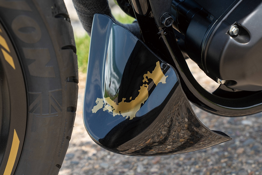 セミダブルクレードルフレームのフロント下に付いたアンダーカウルは、ブラックフィニッシュの中にゴールドで日本列島(かつてヨーロッパで呼ばれた“黄金の国ジパング”が元ネタか)をあしらう。