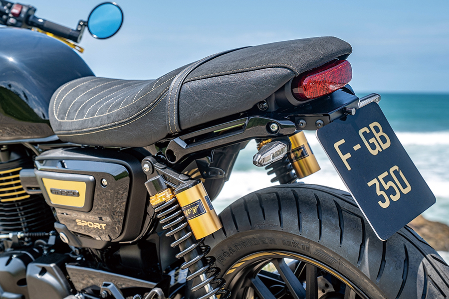 シートもゴールドでカスタムステッチを入れて全体を調和。リヤショックはリザーバー付きに変更し、そのリザーバーとアジャストナットをゴールドにした。リヤフェンダーはカットし、シートエンド下にナンバーを置いた。