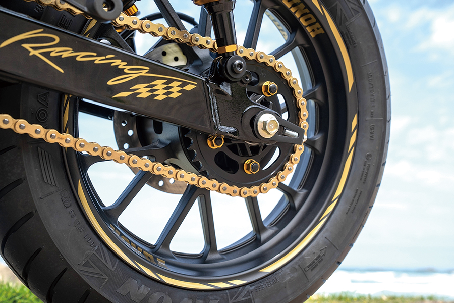ホイールは純正のブラックキャストにゴールドのリムストライプとHONDAロゴを追加。スプロケットナットやドライブチェーンもゴールドカラーでブラックとのバランスを取った。