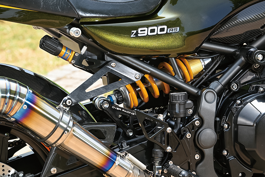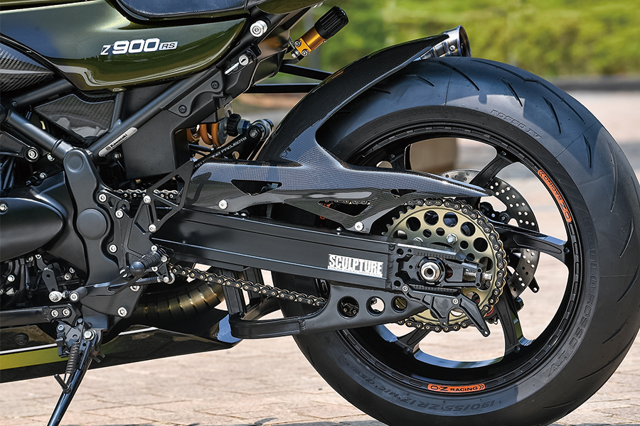 リヤサスはスカルプチャーワイドスイングアーム/モナカ合わせスタビライザーに、別項のようにオーリンズショックを組み合わせる。Z900RSカーボンインナーフェンダーKITもナイトロレーシング製品だ。