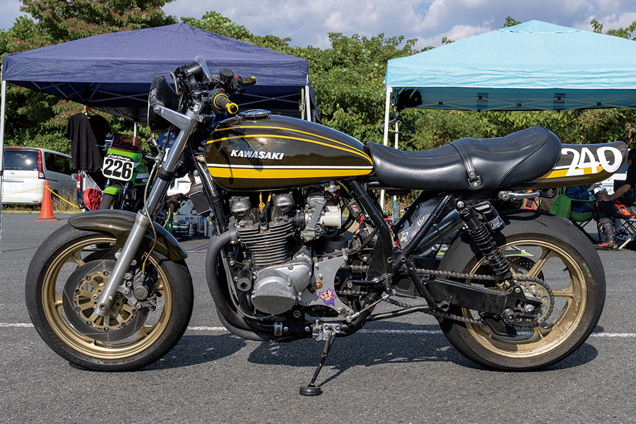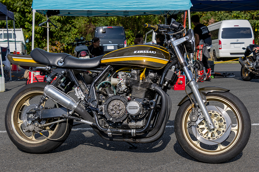 細かいところも加えればかなりのハイブリッド具合なのも注目なのだが、Z1とZRXではフレームワークがまったく異なるということで燃料タンクはドレミコレクション製を加工。さらにこれを浅野さん=3Y’s Factoryがペイント仕上げしたとのこと。タイムへの興味もさることながら、ちょっと面白そうでかなりの力作カスタムという点も楽しませてくれる、そんな1台となっていた。