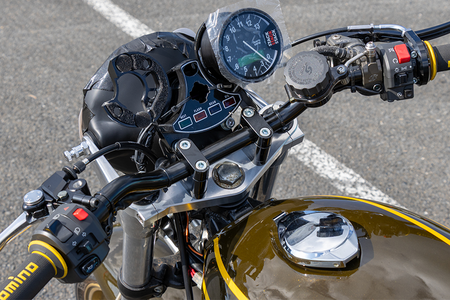ステアリングステムはZRXを加工してZ1のインジケーターマウントし、スタックST700SRダッシュシステム(指針式エンジン回転計+液晶表示速度計)をセット。スピードショップイトウ製ハンドルに付くフロントマスターはゲイルスピードVRCだ。燃料タンクはドレミコレクション製を加工しMRSシートと組み合わせる。