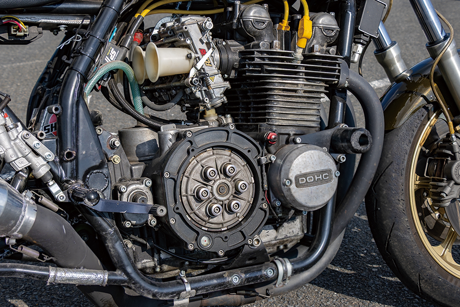 よくよく見ればスイングアームピボットやエンジン背面のパイプワークでZ系でないと分かるフレームはZRX(400)。アンダーループが太くなっていたりなど加工や補強の跡も見える。クラッチはアゲインの乾式を使い、ステップはスピードショップイトウ製をセットしている。
