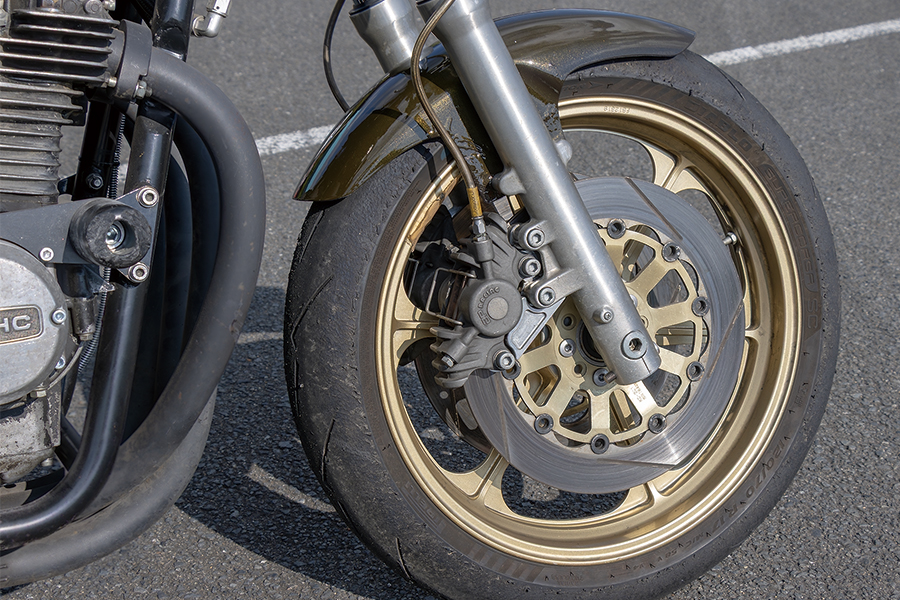 フロントフォークはφ41mmのゼファー750用。フロントブレーキはスピードショップイトウ製サポートでセットされるAP・CP2696キャリパーにサンスターディスクの構成を採る。