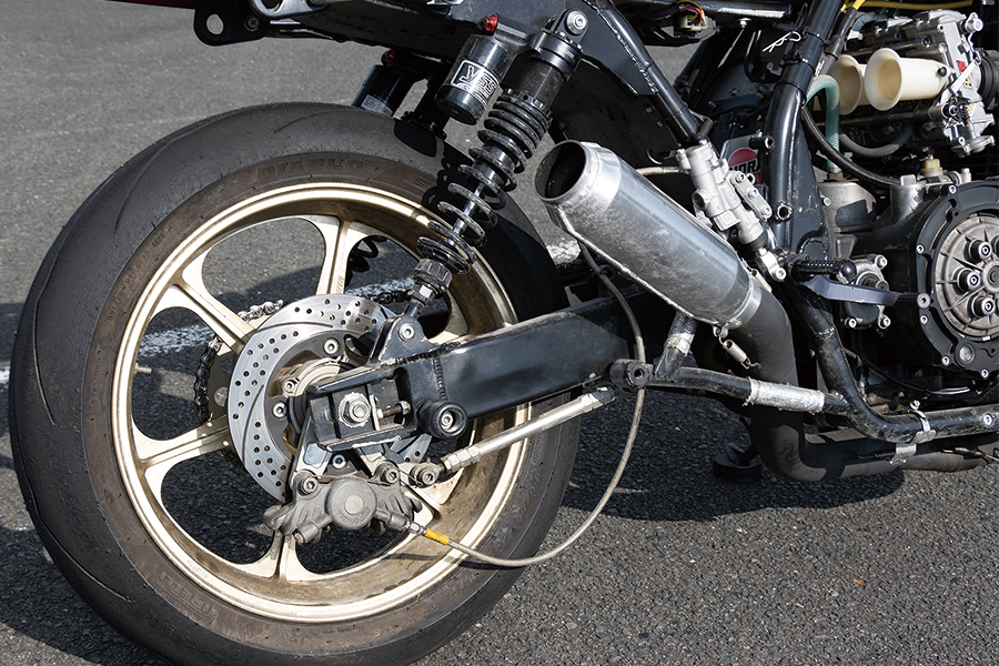 リヤサスはゼファー750用スイングアームを加工してチェーンアジャスターをエキセントリックからプルタイプに変更したものにYSSショックを組み合わせる。リヤブレーキはフロント同様にAP・CP2696キャリパーをスピードショップイトウ製サポートでマウントしてサンスターディスクを組み合わせている。ホイールは3.50-17/5.50-117サイズのゲイルスピードTYPE-Nで、ドライブチェーンは520にコンバートした。