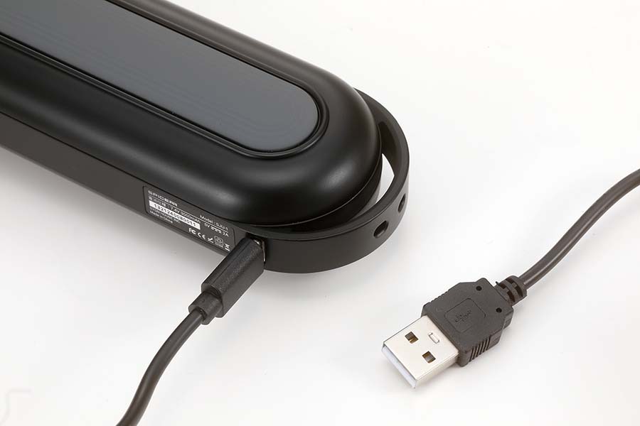 1回の充電で10分(風量強)〜100分(同弱)使えるリチウムイオンバッテリーを装備。給電は付属のUSB Type-Cケーブルによる。本体重量はたったの306gと超軽量。