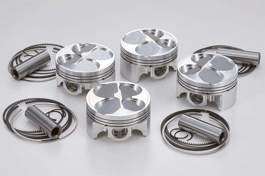 写真は73mmピストンキット。設計開発は国内の老舗メーカーで行われるもので、ピストンで最も重要となるラウンド率は日本ならではの厳しい検品基準を実施することで高品質を確保した、まさにメイドインジャパンクオリティ。ピストン本体の素材には靭性に優れたA4032材が採用されている。