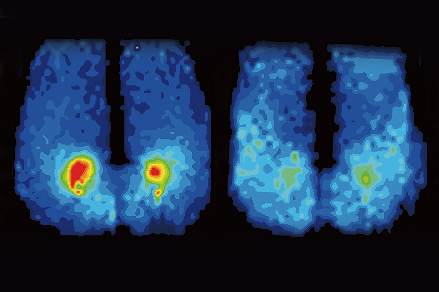 内装されるエクスジェル(右)の体圧分散効果を示す図だ。不使用時の左側は座骨部に大きな負担がかかっているのが分かるだろう。